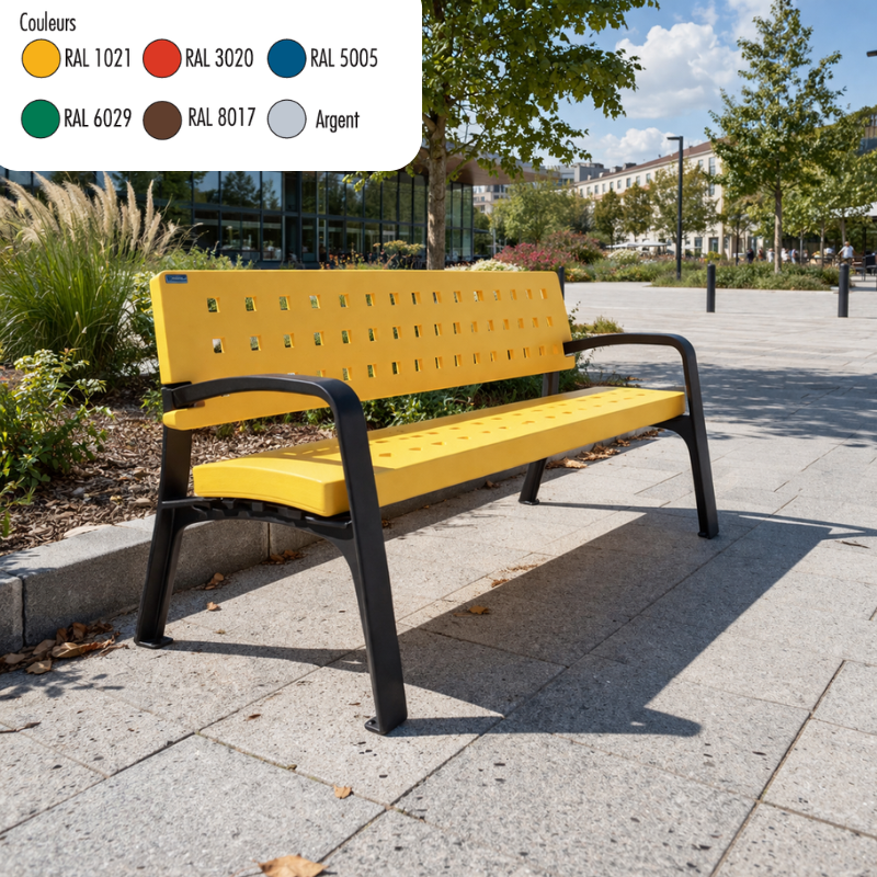 Banc extérieur conçu pour l’aménagement des espaces publics des collectivités, parcs et établissements scolaires.