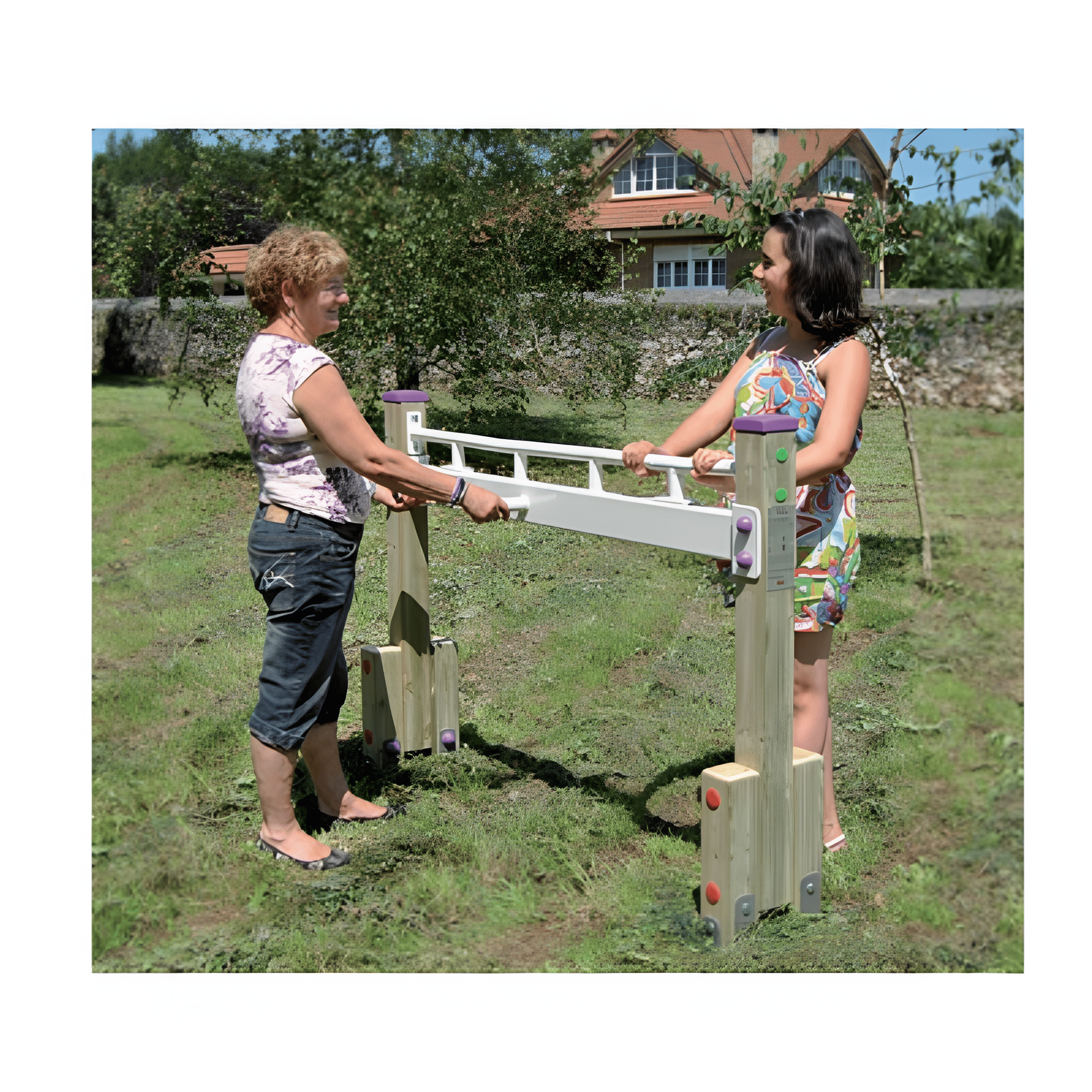 La structure est composée de poteaux en bois associés à une barre équipée de poignées rotatives, permettant d’effectuer des mouvements circulaires pour travailler la mobilité des poignets et la dextérité des mains. L’ensemble est conçu pour résister à un usage intensif en extérieur et aux conditions climatiques.