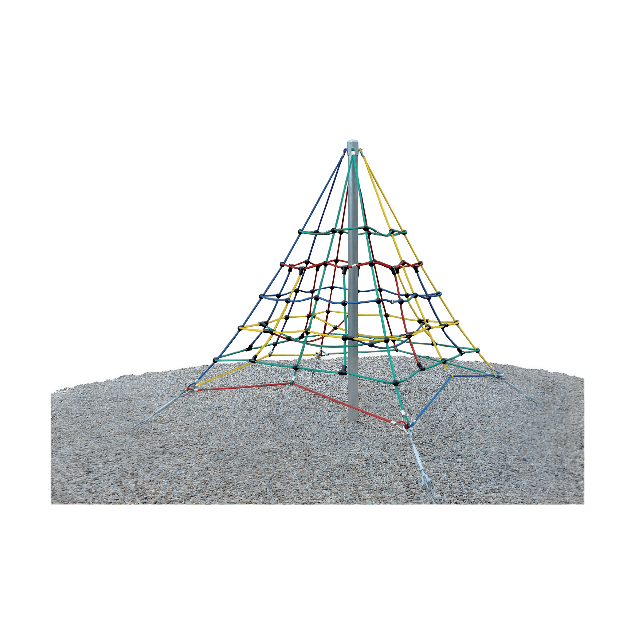 L’équipement est composé d’un mât central robuste associé à un filet de cordes résistantes disposé en structure pyramidale. Les cordages techniques offrent une excellente résistance à l’usure, aux intempéries et aux utilisations intensives dans les environnements extérieurs.