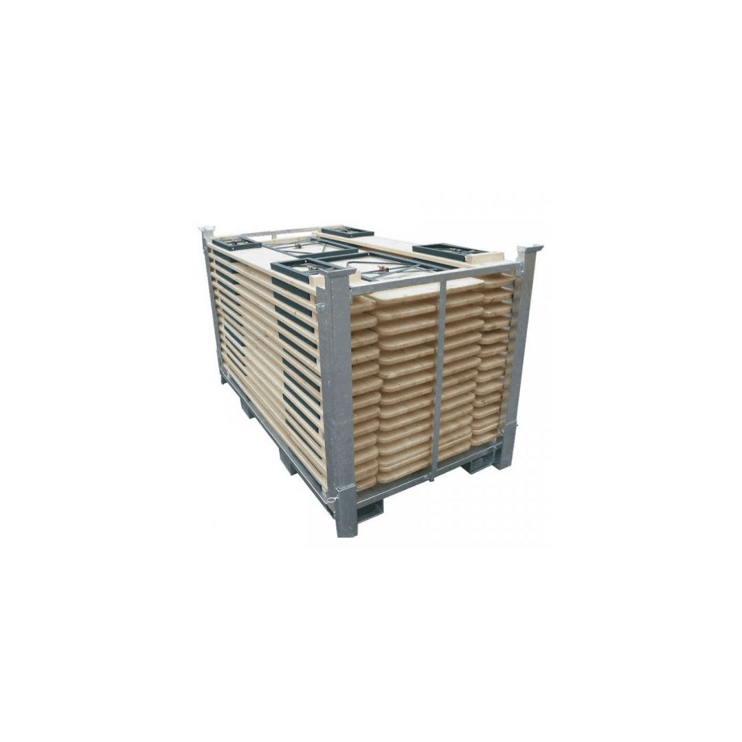 Ce rack est utilisé par les services municipaux pour le stockage et le transport de mobilier de réception. Sa conception démontable permet une optimisation de l’espace lors des périodes hors utilisation.